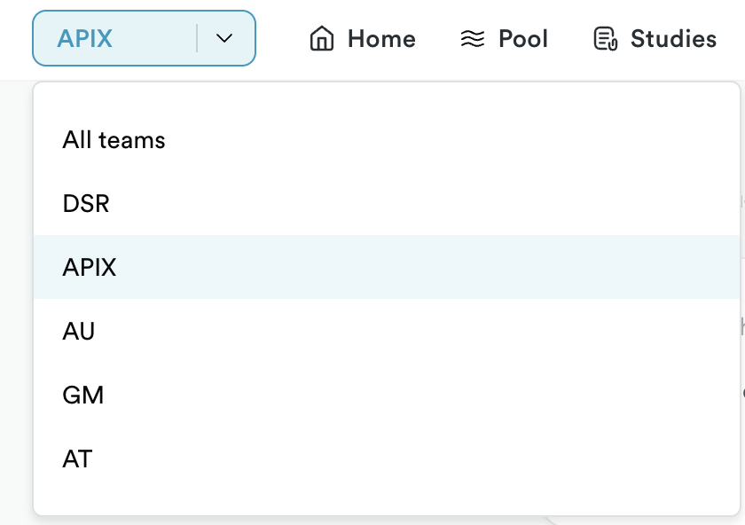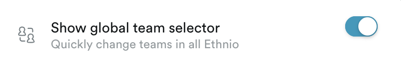 Once you have setup your teams in Ethnio, you can use the global team selector, which will display in the top-left of your navigation as a quick way to switch between teams. Enterprise only.