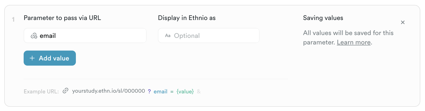 Each Embedded Data question lets you create multiple URL parameters. You do not need to define values. If you only add a parameter (like email or user_id) and leave values empty: Ethnio will automatically save ANY value passed in the URL.