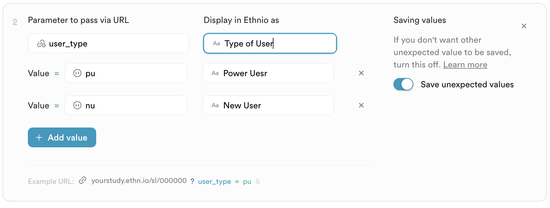 You can setup names for both parameters and values for clarity inside other parts of Ethnio, but these are all totally optional. If you have cryptic parameter or value names, then use the "display in Ethnio as" to help remind you what they do. For parameters: