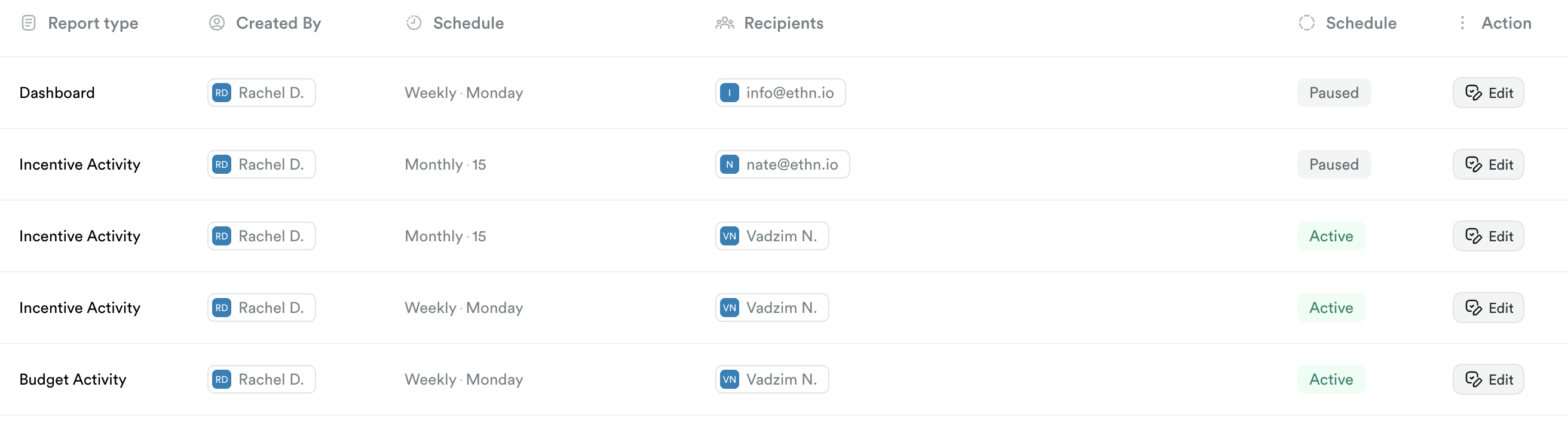 You can generate a daily, weekly, or monthly email report and send it to any email from a few places around Ethnio. Individual reports can be created from places like incentives >> activity, or you can create and edit all your email reports from Reports > Emails.